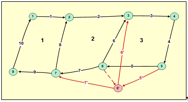 На мал. 5 показано, як точка 6 переміщується та займає нове положення в 6'. Інформація в інших таблицях ("Ребра" та "Полігони") не змінюється взагалі, при цьому топологічність об’єкта повністю зберігається, тобто не виникає ніяких розривів або накладань, оскільки ребра 5, 6 та 7 займуть нові положення: відповідно 5', 6'та 7'. Така організація даних, по суті, перетворює межі земельних ділянок в "еластичні межі", а саме земельно-кадастрове покриття – в "гумову плівку" (rubbersheeting) або в кадастрову тканину (cadastralfabric).